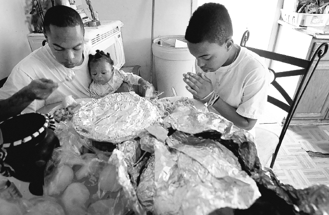 Thanks in order: Cherry prays over Thanksgiving dinner with her sister’s boyfriend, Terrence Rainey, and his son, TA’Derius, 7 months. The meal was provided by Youth Villages counselors. With the help of Youth Villages, Cherry has begun trying to get her life together, control her rebellion and finish school.