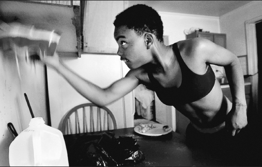 Sibling concern: Tshaica Mallory (left), Cherry’s older, tough-love sister, lets Cherry know that she disapproves of her dressing like a boy. Joyce Patillo (in mirror), Cherry’s mentor from theEmmanuel Center, drove Cherry to Tshaica’s home in Hickory Hill to pick up her birth certificate and health card. Tshaica helps manage the budget at the house where Cherry lives.