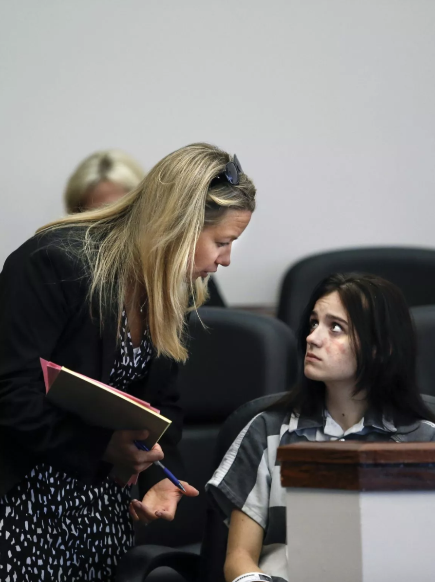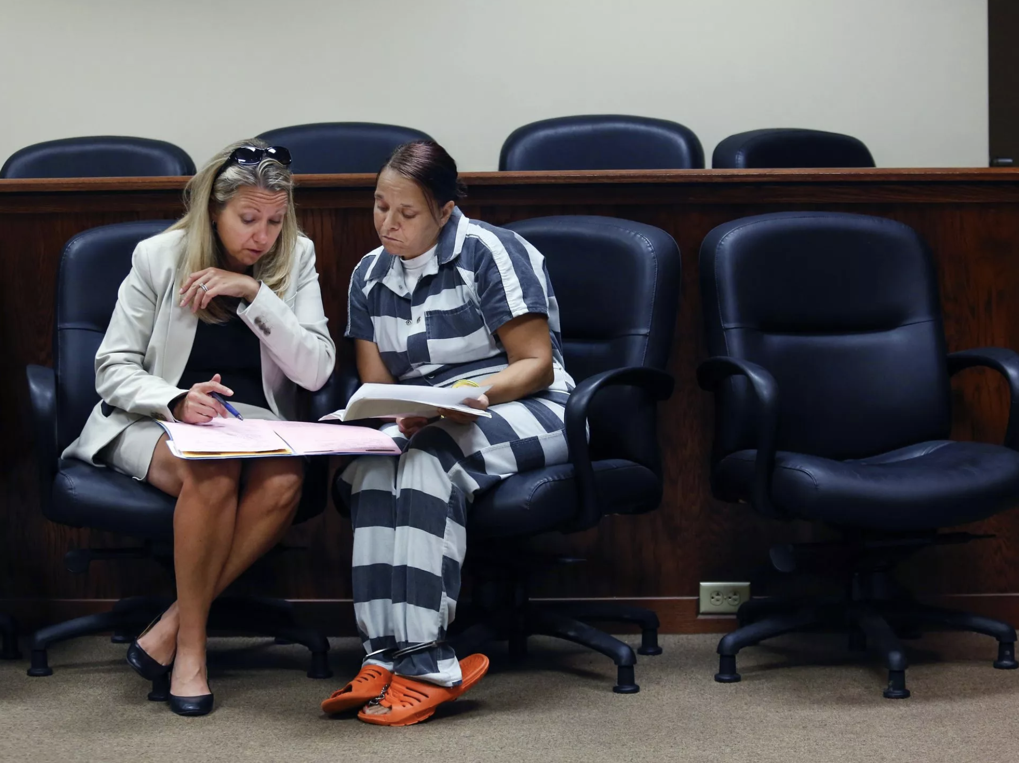 Assistant Public Advocate Melanie Lowe discusses the case with one of her clients at the Oldham County courthouse. Aug. 13, 2015