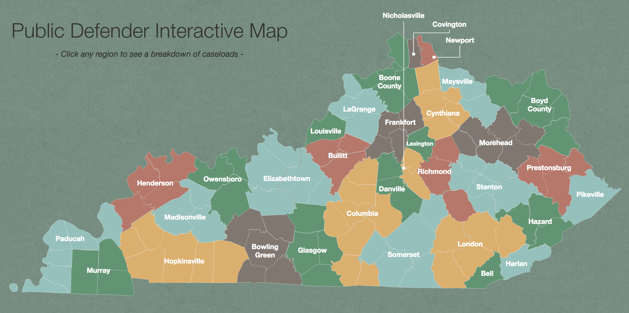 • Kentucky has 333 public defenders in 33 offices to cover every single court in all 120 counties. Some of those offices cover as many as eight counties, which forces some public defenders to drive thousands of miles each year just to reach courthouses, taking time away from arguing cases or talking to clients.
