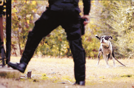 Taking a bite out of crime: A pit bull keeps a close eye on an officer as MPD’s organized crime unit searches for a suspect at a home on Whitefox in South Memphis Nov. 14.